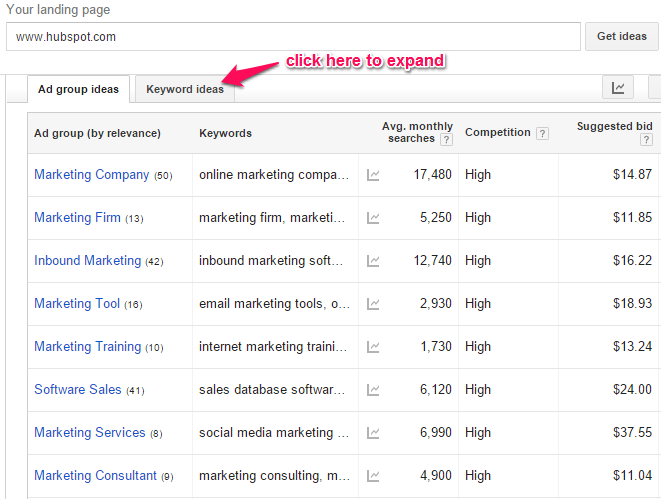Click the “search for new keywords and ad group ideas” — as you can see in the following screenshot.